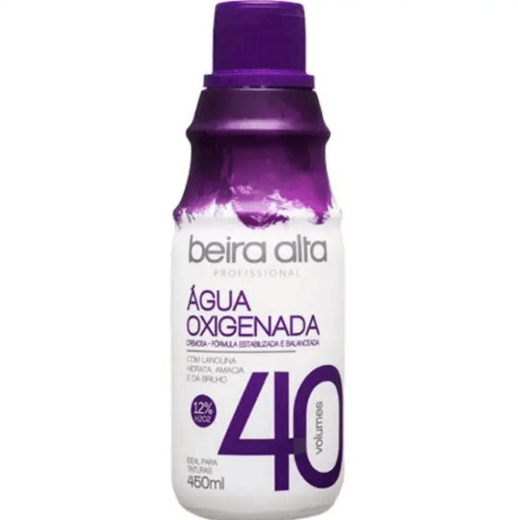 Água Oxigenada Beira Alta 40 Volumes 450ml. Informações do Produto: A Água Oxigenada Beira Alta 40 Vol (12% H2O2 ) é indicada para tinturas de tons claríssimos, podendo clarear até 5 tons. Contém Lanolina, emoliente especial para processos químicos, que hidrata, proporciona brilho, evitando assim o ressecamento dos cabelos. Hidratação e brilho, além de possuir fórmula estabilizada e balanceada.