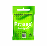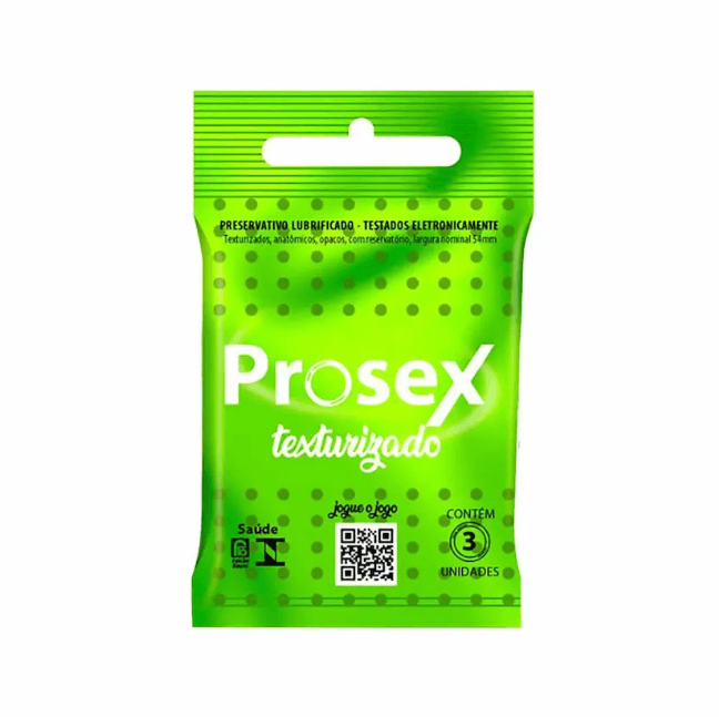 A camisinha Prosex Texturizada Premium é um preservativo de alta lubrificação, que traz um formato com texturas estimulantes pontilhadas e onduladas, além de largura nominal padrão de 54mm. Ele está disponível em sachê com 3 unidades.