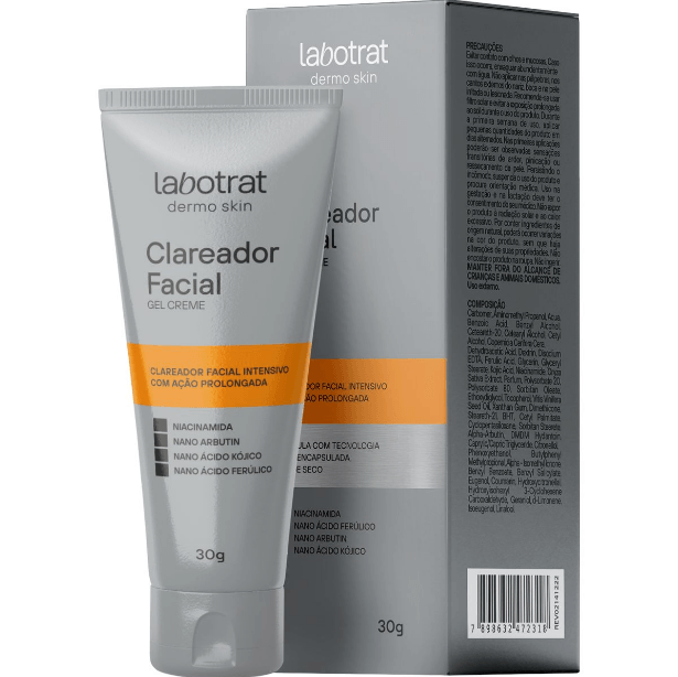 Creme Facial Labotrat Gel Clareador - 30g tem a sua fórmula com um complexo concentrado de ativos clareadores em nano cápsulas, que promovem ação clareadora da pele, de forma segura e eficaz.