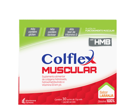 Colflex Muscular é um suplemento alimentar de colágeno hidrolisado, hidroximetilbutirato e vitamina D3 em pó. Possui alto teor de vitamina D, que auxilia no funcionamento muscular. Não contem glúten nem lactose e dissolve rápido.