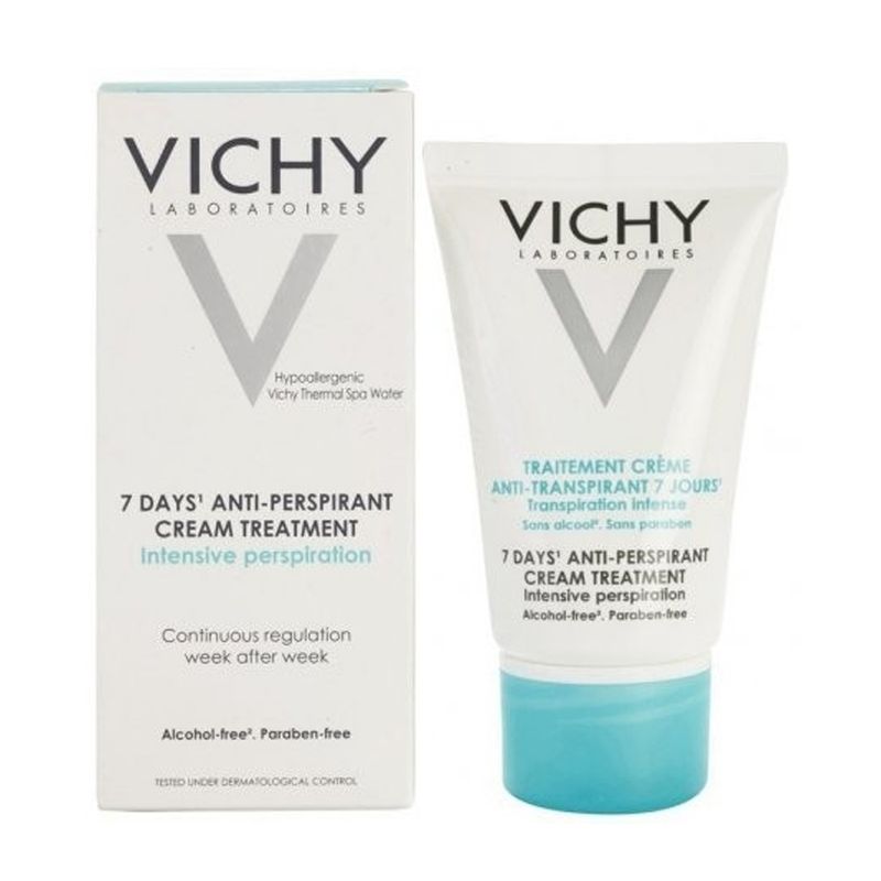 Vichy Desodorante Antitranspirante 7 Dias Creme é um tratamento indicado para pessoas com transpiração excessiva e hiperidrose.