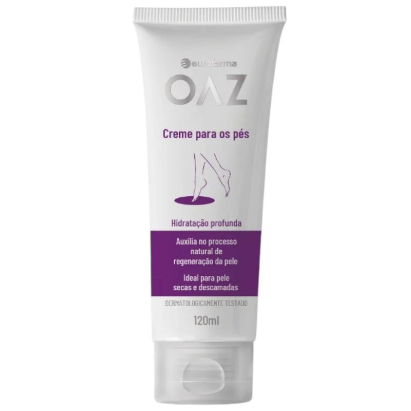 Creme para os Pés OAZ Possui uma sinergia de óleos, silicones, Vitamina E e Ureia, que forma um poderoso blend de hidratação profunda e restauração da pele, reparando a aspereza e melhorando a aparência da pele seca e escamosa dos pés.