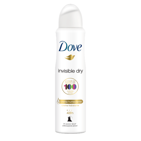 O Desodorante Antitranspirante Aerosol Dove Invisible Dry foi desenvolvido para não deixar manchas brancas em até 100 cores de tecido. Feito com tecnologia superior que cuida e protege as axilas por 72 horas contra suor e mau odor, mantendo as axilas secas o dia todo. Este desodorante foi eleito o número 1 em cuidado da pele das axilas pelas nossas consumidoras. Formulado com 1/4 de creme hidratante e vitamina E, ajuda a manter a hidratação da pele das axilas, e as deixa suaves e macias.