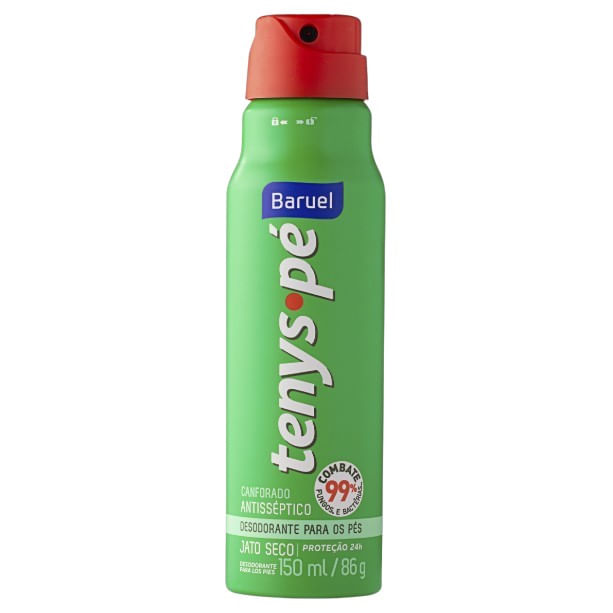 Tenys Pé Baruel Canforado Aerosol é um desodorante antisséptico para os pés em formato spray, desenvolvido para combater odores, fungos e bactérias. Sua fórmula contém cânfora, proporcionando alívio e sensação de frescor, sendo ideal para uso antes e depois de atividades físicas. Ele elimina até 99% dos fungos e bactérias, oferece proteção por até 24 horas, mantém os pés secos e não deixa resíduos visíveis. É dermatologicamente testado e indicado para uso diário, promovendo higiene, bem-estar e proteção prolongada.