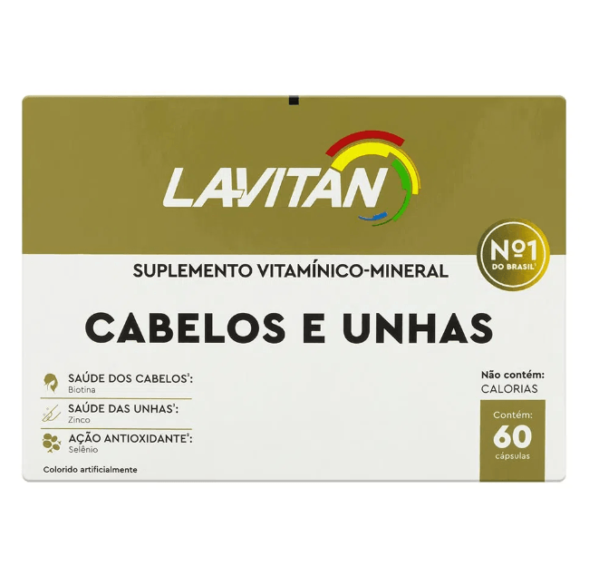 Lavitan Cabelos e Unhas é um suplemento vitamínico-mineral que auxilia no crescimento e fortalecimento de cabelos e unhas. Rico em biotina, vitamina B6 e zinco.