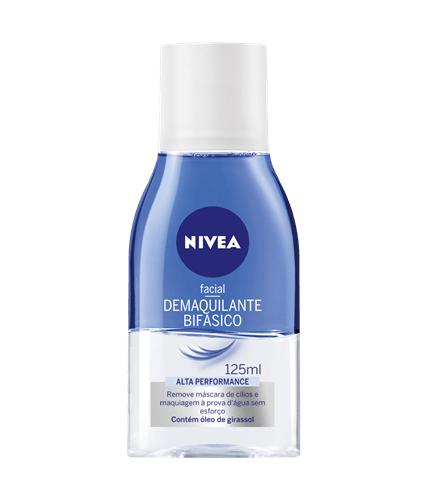 Indicado para a remoção da maquiagem, o Demaquilante Bifásico Nivea limpa sem esforço as maquiagens mais pesadas, inclusive as que são à prova d’água, sem deixar resíduos na pele. É dermatologicamente e oftalmologicamente testado para não agredir as áreas mais delicadas, como olhos e cílios, além de contar com Óleo de Girassol, que não deixa o produto irritar a pele.