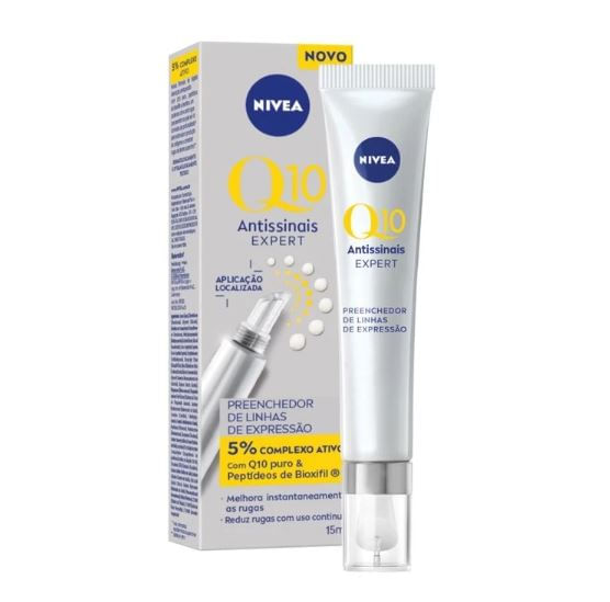 Nivea Preenchedor de Rugas Q10 Expert Antissinais é um preenchedor de linhas de expressão com resultados visíveis em 5 minutos. Desenvolvido para proporcionar melhora instantânea na aparência das rugas e redução das mesmas com o uso contínuo. Para que serve? Com 5% de complexo ativo, este hidratante conta com Q10 puro, Peptídeos de Bioxifil® e creatina, que melhoram instantaneamente a aparência das rugas e reduzem as mesmas com o uso contínuo, estimulando a produção de colágeno.