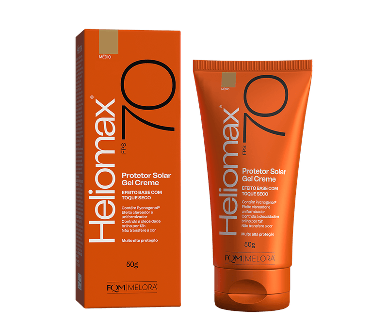 Heliomax Protetor Solar Gel Creme possui base de alta cobertura e toque seco que associa a ação clareadora do Pycnogenol, luteína, cúrcuma e outros super antioxidantes, promovendo ação antienvelhecimento.