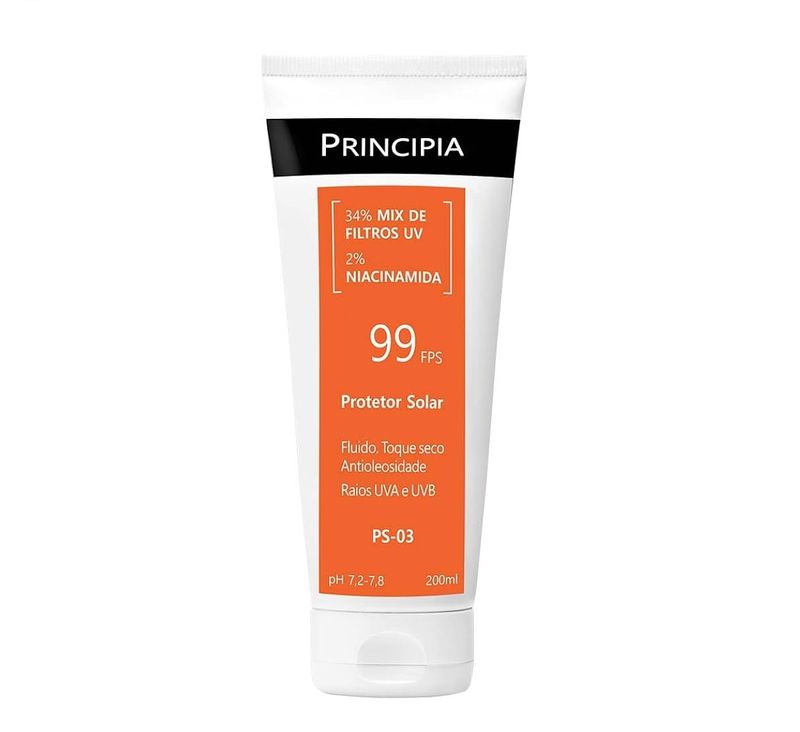 Protetor solar corporal fluido antioleosidade com 34% de filtros UV e 2% de niacinamida, FPS 99, toque seco e eficácia contra raios UVA e UVB.