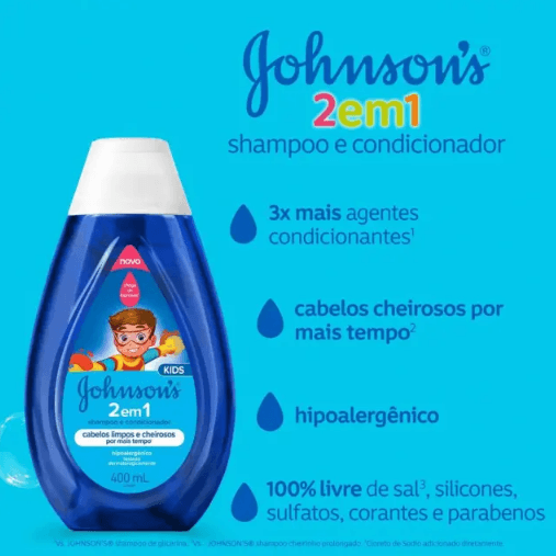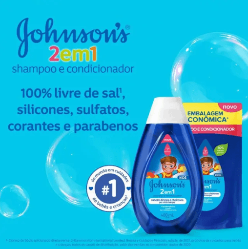 Dermatologicamente testado, Johnson's 2 em 1 também é livre de sal, corantes, parabenos, silicone e sulfatos.