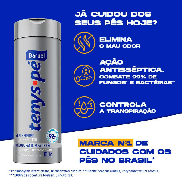 Tenys Pé foi desenvolvido com ingredientes que agem eficazmente no controle da transpiração excessiva, eliminando fungos e bactérias que causam odores.
