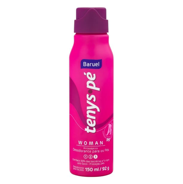 Tenys Pé Woman Jato Seco é um desodorante para os pés com ação antitranspirante e antisséptica. Ele combate até 99% de fungos e bactérias, garantindo 24h de proteção contra os odores da transpiração.