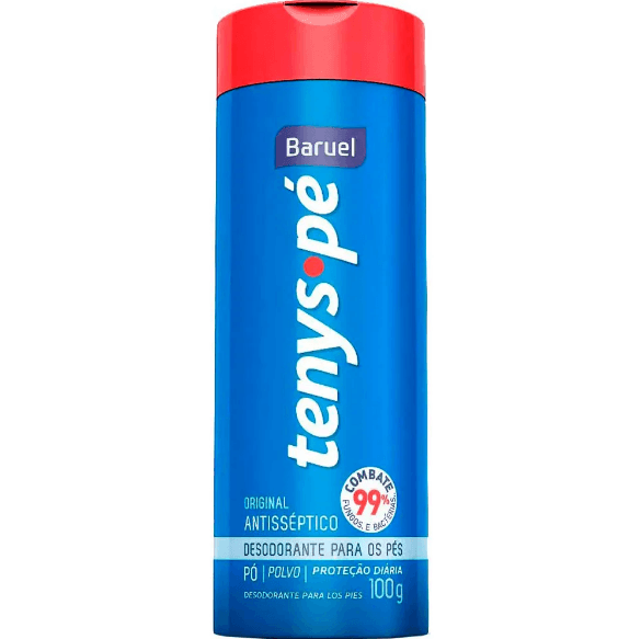 Tenys Pé Baruel Original em pó oferece ação antisséptica, combate fungos e bactérias, previne frieiras e micoses, elimina o mau odor e mantém os pés secos, protegidos e cheirosos, sendo ideal para uso diário e após atividades esportivas.