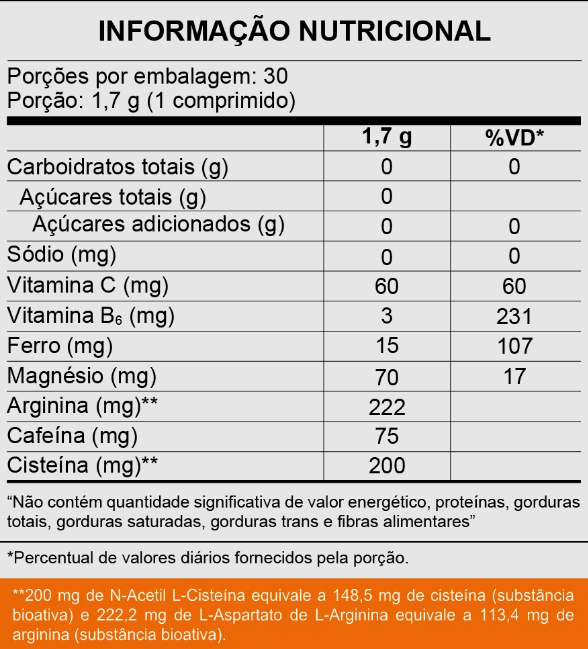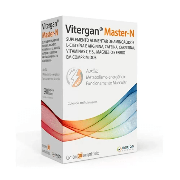 Vitergan Master N é um suplemento alimentar de aminoácidos em comprimidos formulado com L-cisteína e Arginina, Cafeína, vitaminas C e B6 , Magnésio e Ferro.